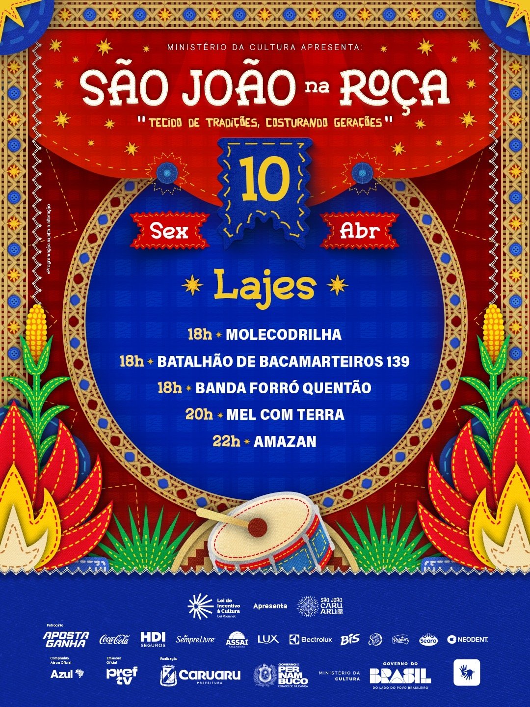 A abertura do São João de Caruaru 2026 será nesta sexta-feira (10 de abril) com o início do São João na Roça, que percorrerá 13 localidades rurais de Caruaru, nos próximos finais de semana, até o dia 23 de maio. A programação conta com 100% de forró, 75% de artistas caruaruenses e o total de 68 atrações regionais (entre cantores, bandas de forró e de pífanos, batalhões de bacamarteiros e quadrilhas juninas).