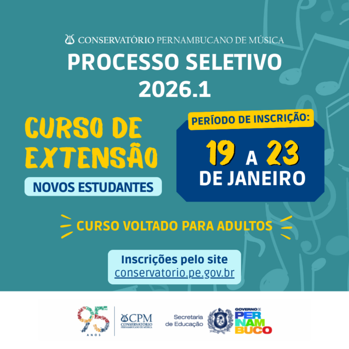 O Conservatório Pernambucano de Música (CPM) está com as inscrições abertas para a seletiva do Curso de Extensão 2026.1. O curso representa uma oportunidade para adultos que desejam aprofundar sua relação com a música de forma contínua, em um ambiente acolhedor e com acompanhamento especializado. Os interessados podem se inscrever gratuitamente até o dia 23 de janeiro, exclusivamente pelo site da instituição: conservatorio.pe.gov.br