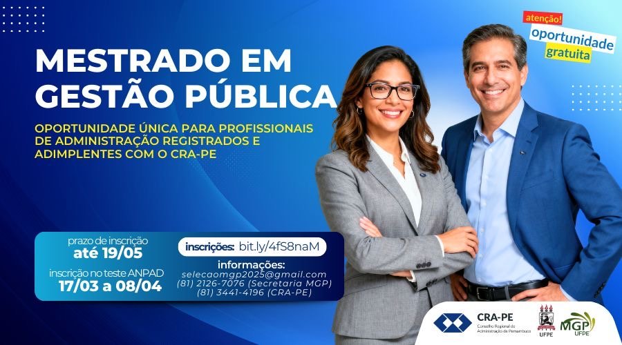 O Conselho Regional de Administração de Pernambuco (CRA-PE) firmou convênio com a Universidade Federal de Pernambuco (UFPE) para custear integralmente o Mestrado Profissional em Gestão Pública para o Desenvolvimento do Nordeste (MGP), exclusivamente para profissionais de Administração registrados e adimplentes no CRA-PE. O registro pode ser solicitado no site crape.org.br