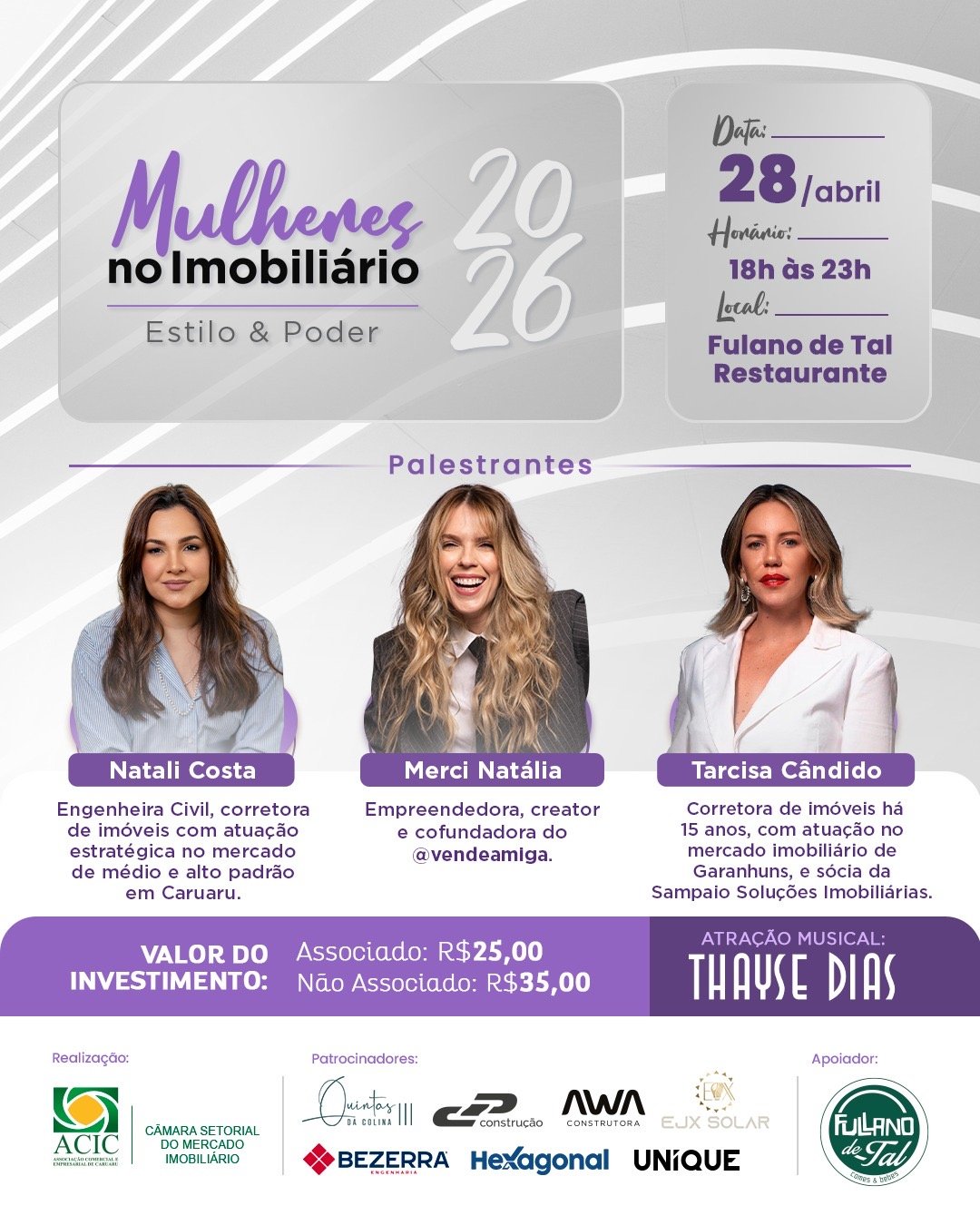 Com o tema “Estilo e Poder”, o evento contará com palestras de Natali Costa, Merci Natália e Narcisa Cândido. Natali Costa é engenheira civil e corretora de imóveis com atuação estratégica no mercado de médio e alto padrão em Caruaru. Merci Natália é empreendedora, criadora e cofundadora do @vendeamiga. Já Narcisa Cândido atua há 15 anos no setor, é sócia da Sampaio Soluções Imobiliárias e tem forte presença no mercado de Garanhuns. A programação também terá a apresentação musical da cantora Thayse Dias.