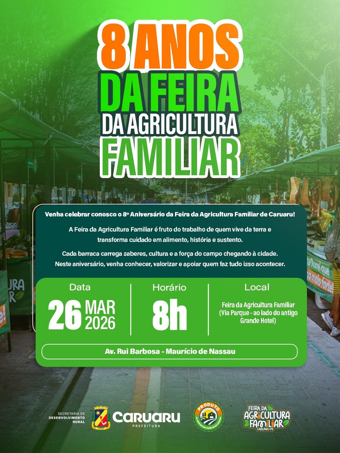 A Feira da Agricultura Familiar de Caruaru celebra oito anos nesta quinta-feira (26). Para comemorar a data, uma programação especial será realizada a partir das 8h, na Feira da Via Parque. Terá entrega de sementes para agricultores, atividades educativas alusivas ao Dia Mundial da Água, entre outras.