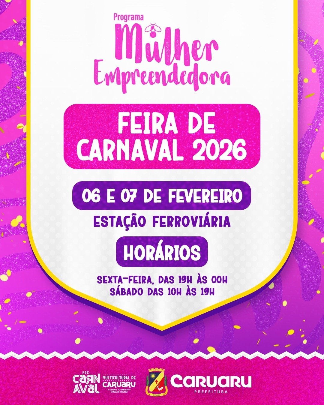 Empreendedorismo feminino, economia criativa e valorização do trabalho das mulheres vão ocupar a Estação Ferroviária de Caruaru durante o Pré-Carnaval Multicultural, com a realização da Feira da Mulher Empreendedora, promovida pela Prefeitura de Caruaru, por meio da Secretaria da Mulher, nesta sexta-feira (6) e sábado (7).