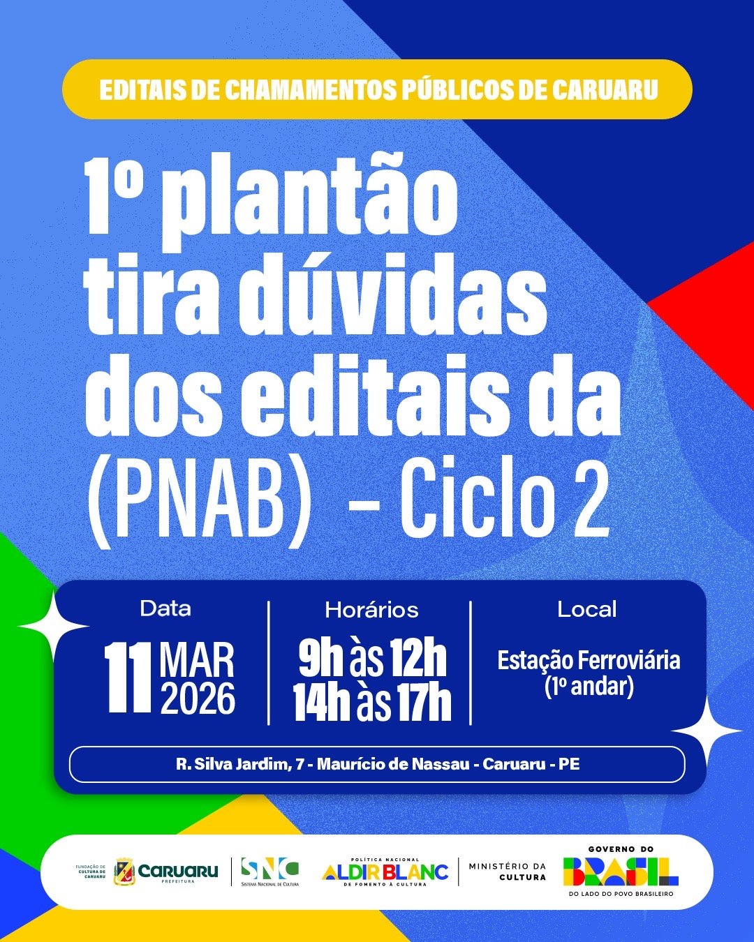 A Fundação de Cultura de Caruaru promove, no dia 11 de março, o 1º plantão tira-dúvidas dos editais da Política Nacional Aldir Blanc de Fomento à Cultura (PNAB) – Ciclo 2. A iniciativa é voltada para artistas, produtores culturais e fazedores de cultura que desejam obter orientações sobre os chamamentos públicos do município.