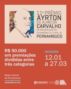 Sobre a premiação – Criado em 2015, o Prêmio Ayrton de Almeida Carvalho tem como objetivo reconhecer iniciativas bem-sucedidas da sociedade civil que atuem na preservação do patrimônio cultural em suas diferentes formas de expressão. Podem participar pessoas físicas ou jurídicas, com ações realizadas parcial ou integralmente em Pernambuco, concluídas entre 2023 e 2025, ou em execução com etapas já finalizadas.