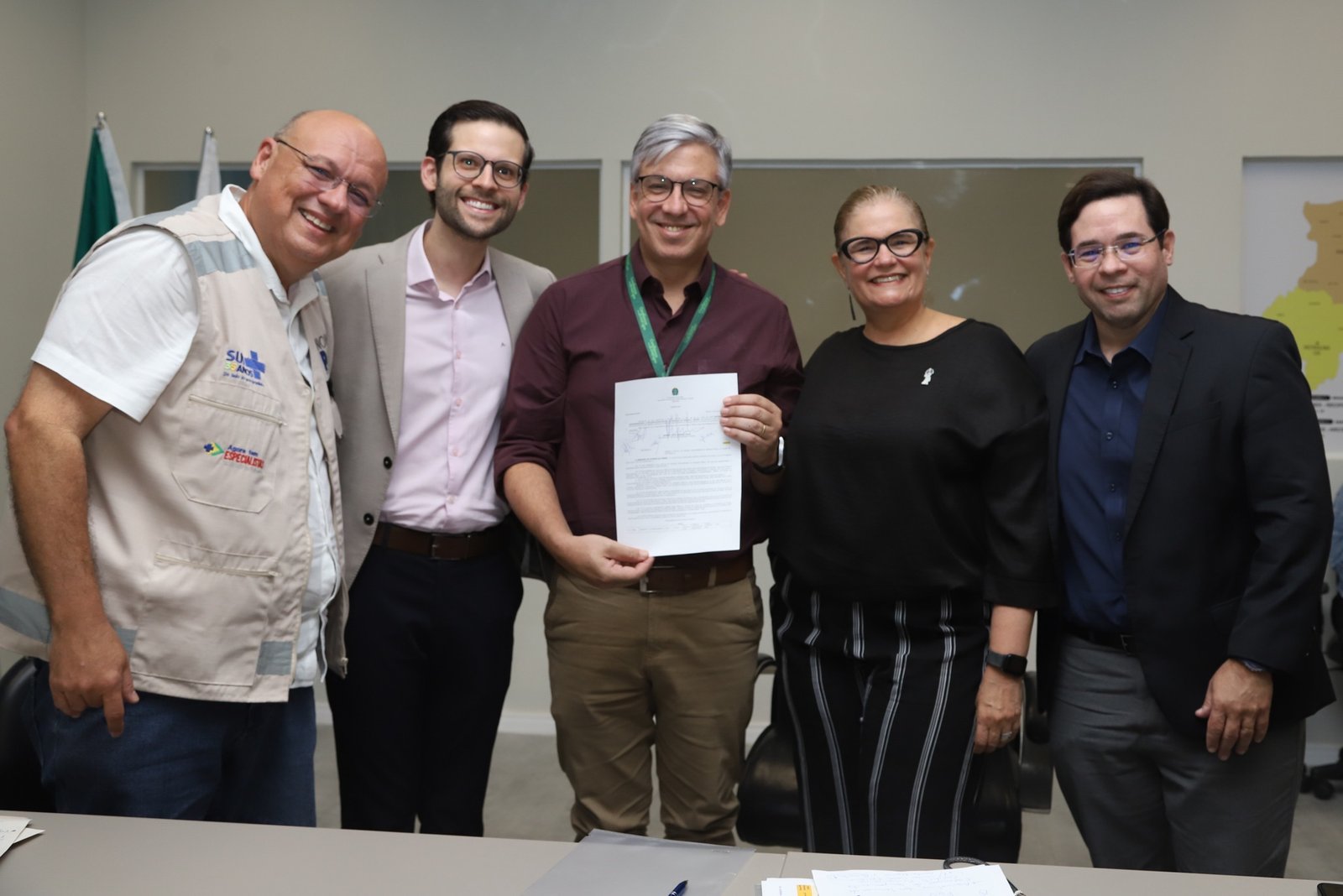 Foto 1: Mozart Sales (Secretário de Atenção Especializada a Saúde), Dr Diogo Soares (Médico geneticista do RHP), Dr Pedro Casé (Diretor de Relacionamento Médico e Institucional do RHP), Zilda Cavalcanti (Secretária de Saúde do Estado de PE) e Elídio Moura (Presidente do Cosems-PE). Créditos: Divulgação Secretaria de Saúde de PE