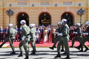 Em frente ao Palácio do Campo das Princesas, a gestora recebeu as continências regulamentares, foi apresentada à Guarda de Honra e realizou a revista da tropa. “Estamos celebrando aqueles que vieram antes de nós, lutando as mesmas lutas, por mais democracia, justiça, por um governo que chegue verdadeiramente na vida daqueles que mais precisam. Que possamos honrar o legado e as tradições daqueles que colocaram a sua vida em favor do povo pernambucano”, completou Raquel Lyra.