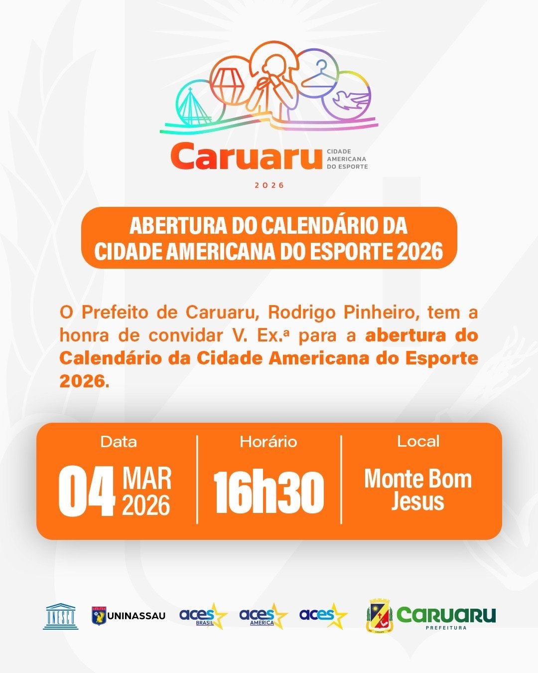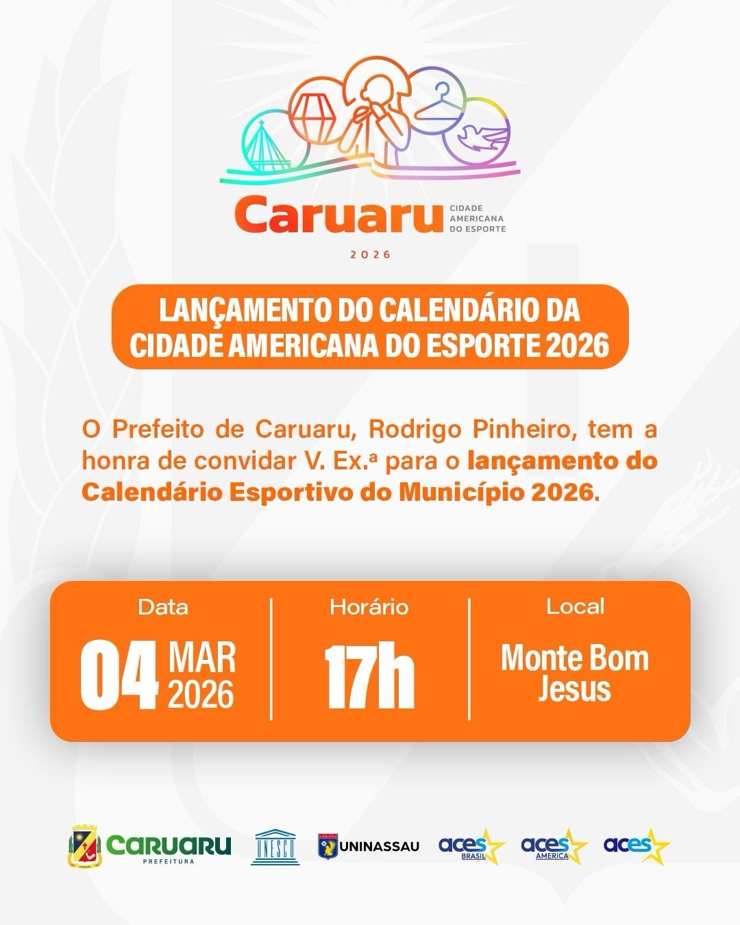 A Prefeitura de Caruaru, por meio da Secretaria Executiva de Esportes, realiza nesta quarta-feira (4), às 17h, no Monte Bom Jesus, o lançamento oficial do Calendário da Cidade Americana do Esporte 2026. O evento vai apresentar a programação esportiva do município para o ano, reunindo autoridades, atletas, representantes de modalidades e convidados.