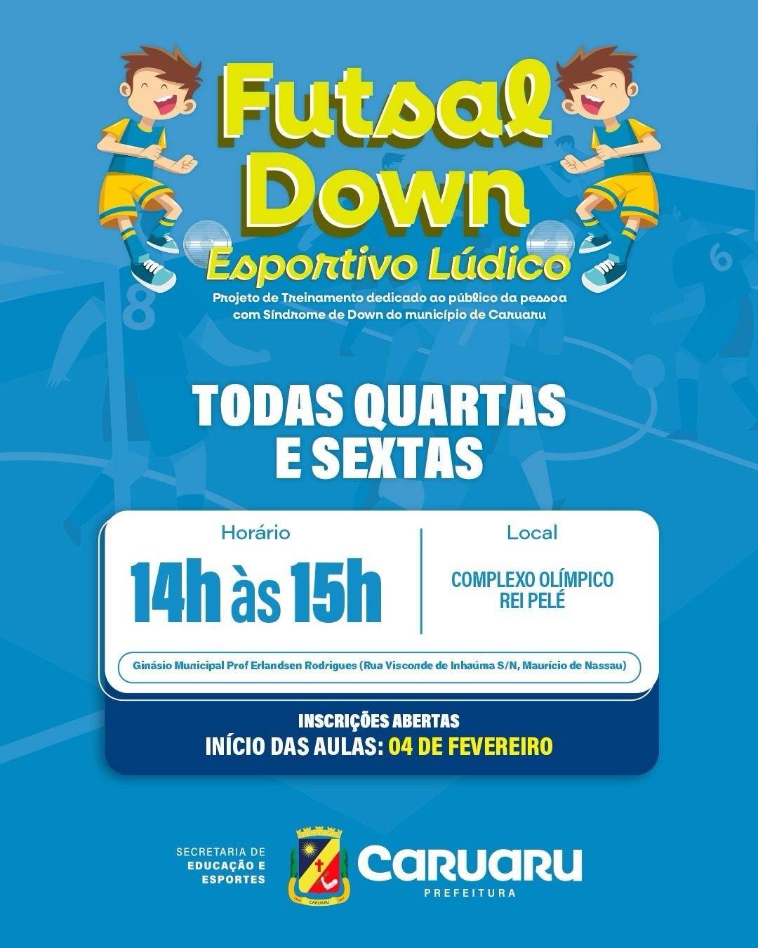As aulas acontecem no Ginásio Municipal Professor Erlandsen Rodrigues, localizado no Complexo Olímpico Rei Pelé, às quartas e sextas-feiras, das 14h às 15h, com vagas livres. As inscrições devem ser realizadas de forma on-line, por meio do site caruaru.digital.esp.br, com a obrigatoriedade de anexar o laudo do atleta. O retorno das atividades está previsto para o dia 4 de fevereiro.