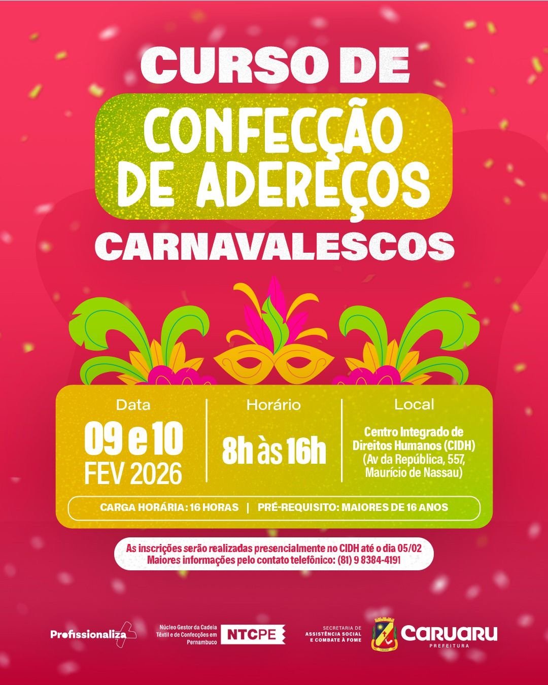 Estão abertas as inscrições para o Curso de Confecção de Adereços Carnavalescos, que será realizado nos dias 9 e 10 de fevereiro de 2026, das 8h às 16h, no Centro Integrado de Direitos Humanos (CIDH), na Avenida da República, 557, Maurício de Nassau. A formação oferece 25 vagas para pessoas a partir de 16 anos e tem carga horária de 16 horas.