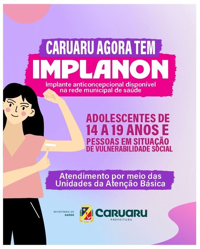 A Prefeitura de Caruaru, por meio da Secretaria Municipal de Saúde (SMS), passa a ofertar o implante anticoncepcional subdérmico (Implanon) na rede municipal de saúde. A ação integra o Programa de Ampliação da Oferta de Métodos Contraceptivos e Planejamento Familiar, fortalecendo a promoção da saúde sexual e reprodutiva no município.