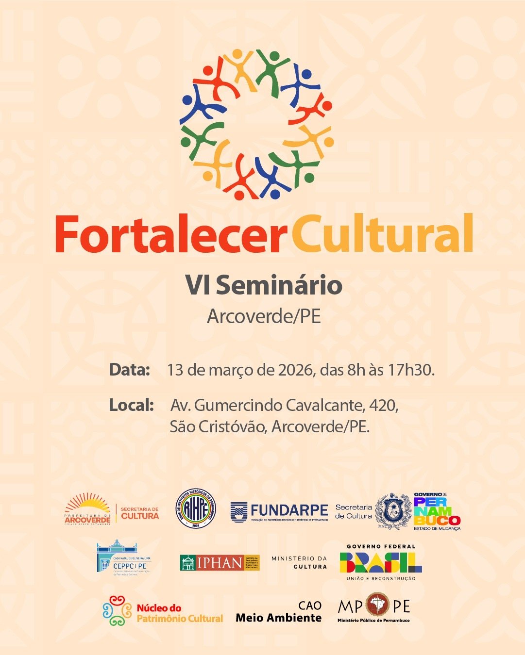 O Ministério Público de Pernambuco (MPPE), por meio do Núcleo do Patrimônio Cultural (NPC), promoverá o VI Seminário do Projeto Fortalecer Cultural, em Arcoverde, no dia 13 de março. O evento ocorrerá das 8h às 17h30, na Autarquia de Ensino Superior de Arcoverde, que fica localizada na Avenida Gumercindo Cavalcante, no bairro São Cristóvão, em Arcoverde.