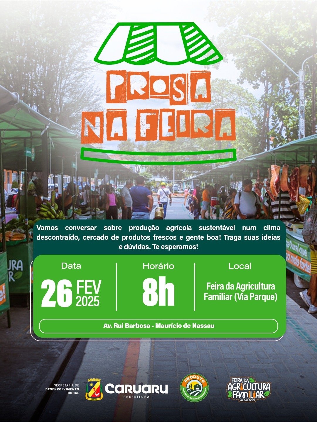 A Prefeitura de Caruaru realiza, nesta quinta-feira (26), às 8h, a primeira edição do Prosa na Feira – Agroecologia, na Feira da Agricultura Familiar da Via Parque. O evento, promovido pela Secretaria de Desenvolvimento Rural (SDR), fortalece a agricultura familiar e incentiva práticas sustentáveis no município.