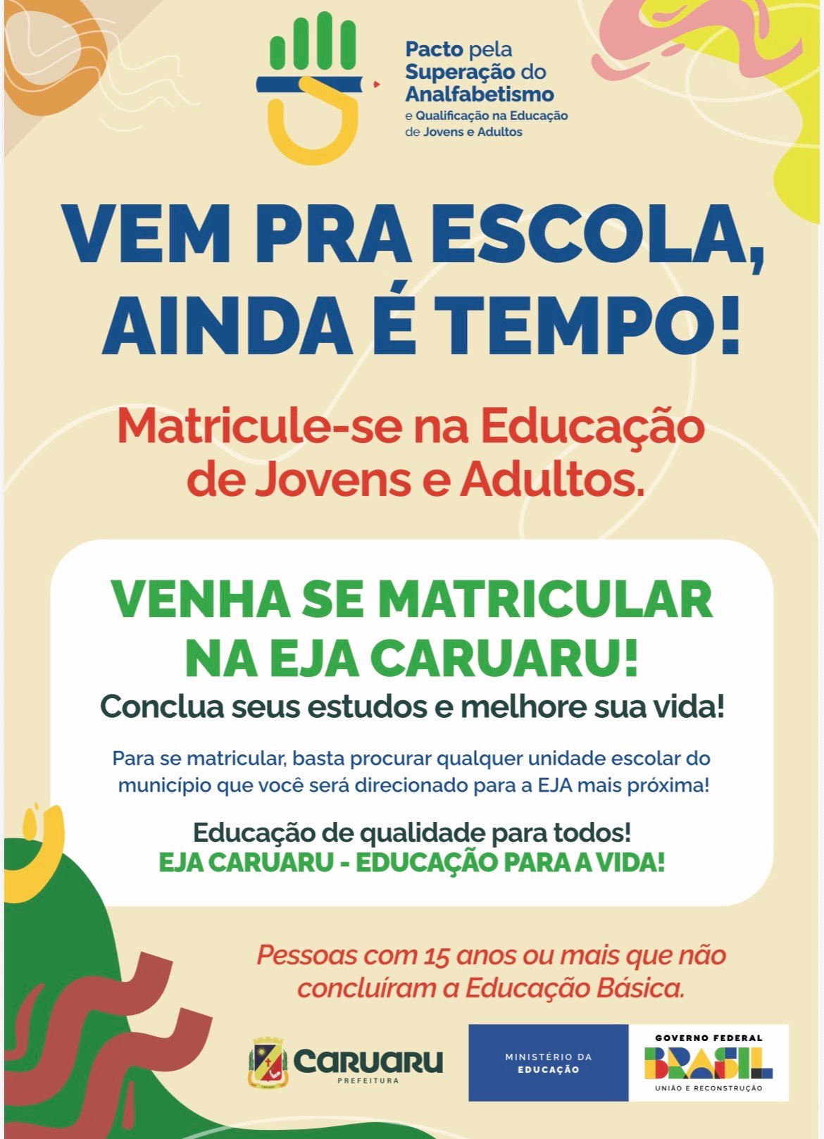 Está prorrogado, até o dia 27 deste mês, o processo de matrículas 2026 para a Educação de Jovens e Adultos (EJA) de Caruaru. As vagas são destinadas a jovens, adultos e idosos que não concluíram a Educação Básica e desejam retornar à escola.