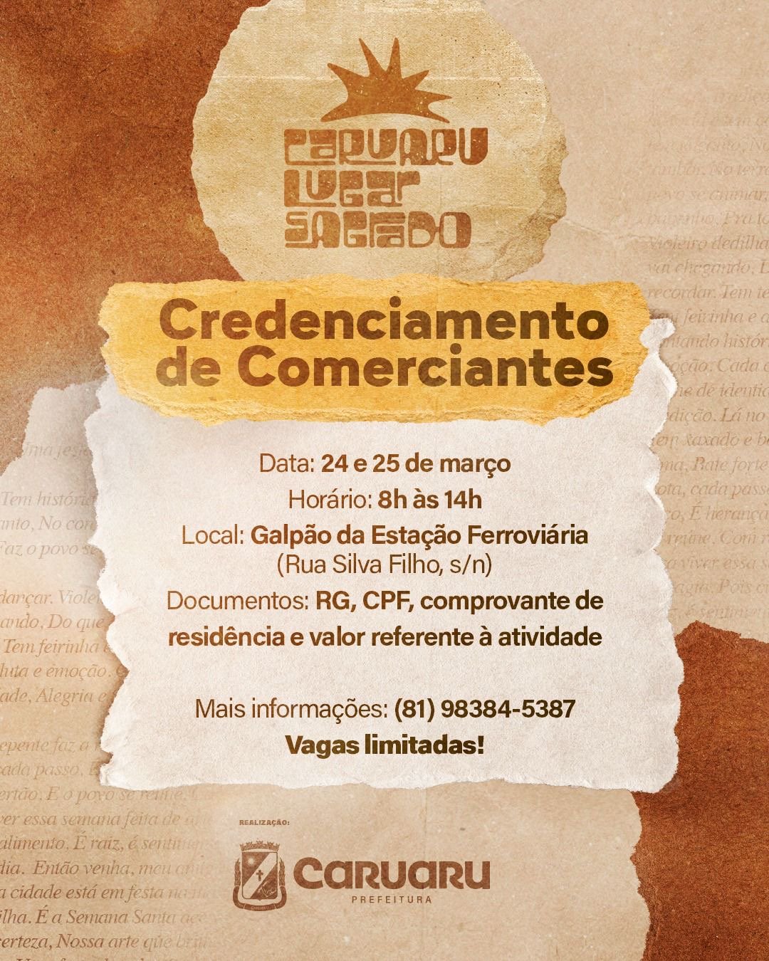 A Secretaria da Fazenda de Caruaru (Sefaz) inicia o credenciamento de comerciantes interessados em atuar no evento Caruaru Lugar Sagrado 2026, realizado durante a Semana Santa.