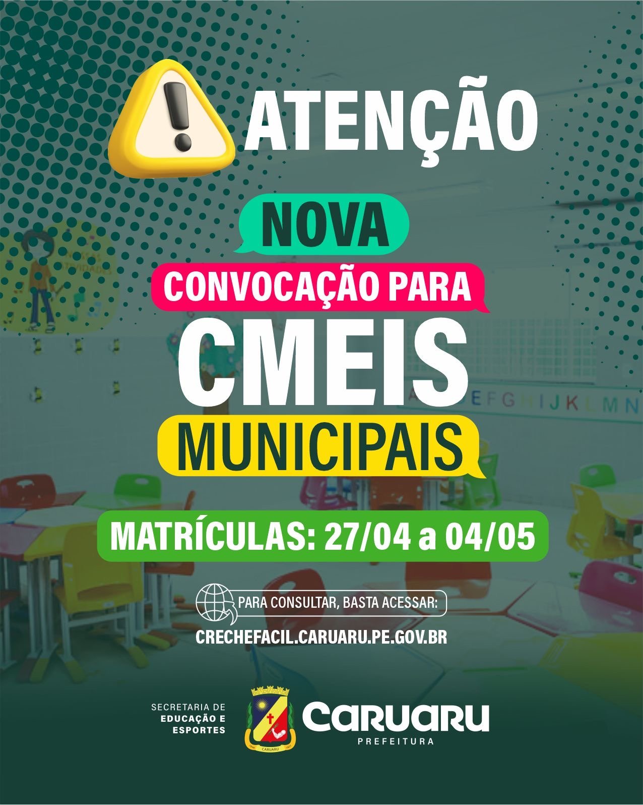 A Secretaria de Educação de Caruaru, por meio do site oficial “Creche Fácil”, divulgou uma nova convocação de crianças contempladas com vagas nos Centros Municipais de Educação Infantil (CMEIs). O resultado está disponível através do endereço eletrônico: https://crechefacil.caruaru.pe.gov.br e pode ser consultado pelos responsáveis dos menores.