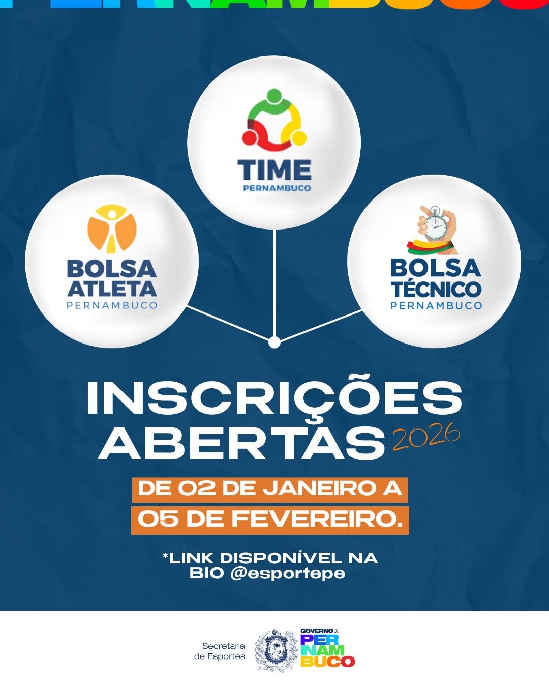 As inscrições para os programas Bolsa Atleta, Bolsa Técnico e Time Pernambuco 2026 já estão abertas. A iniciativa do Governo de Pernambuco, por meio da Secretaria de Esportes, teve início à 0h do dia 2 de janeiro e segue até às 16h59 do dia 5 de fevereiro. Os programas integram a política estadual de fortalecimento, valorização e incentivo ao esporte em todo o território pernambucano.