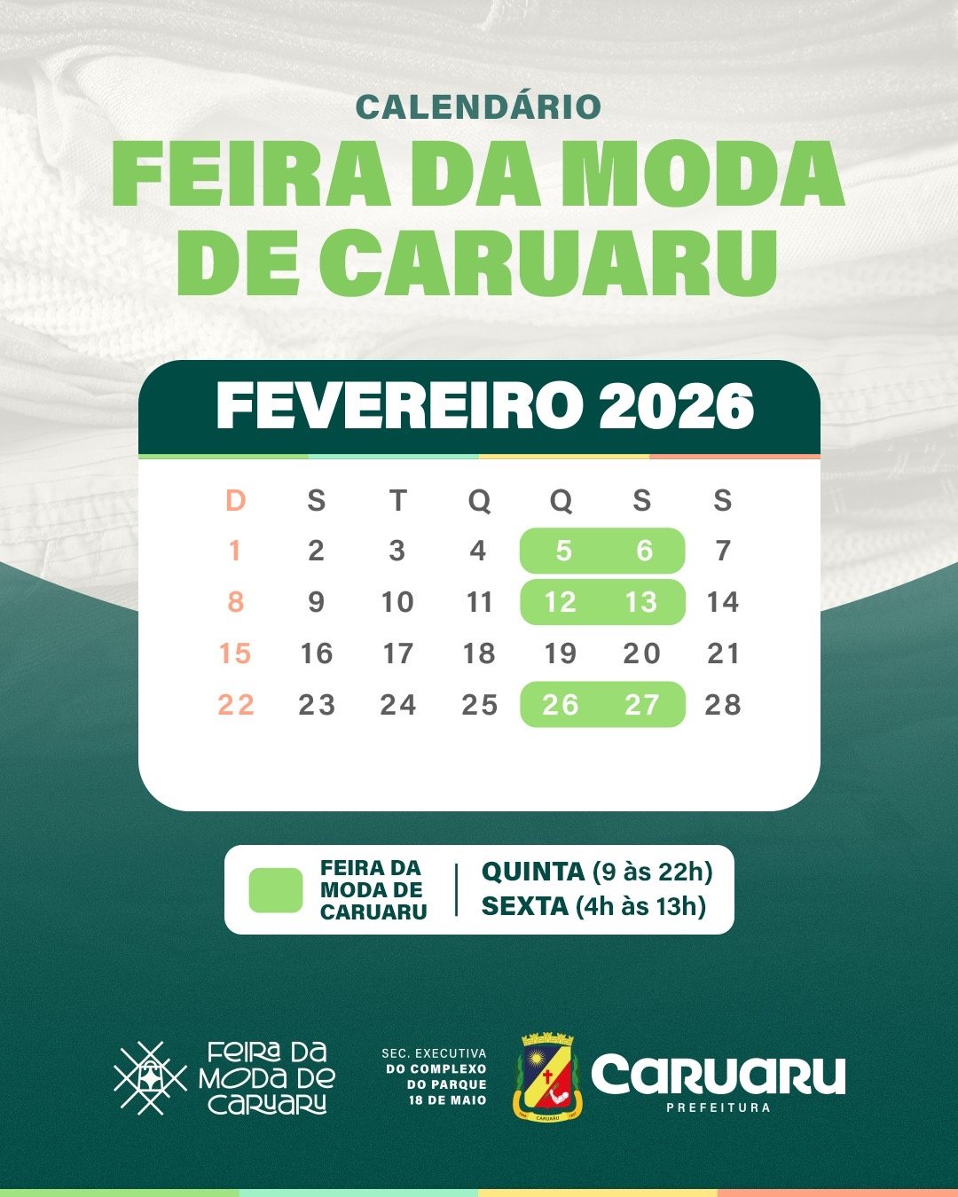 Feirantes, compradores e visitantes já podem se programar para o mês de fevereiro: a Secretaria Executiva do Parque 18 de Maio divulgou o calendário da Feira da Moda de Caruaru, com as datas de funcionamento definidas para o segundo mês do ano.