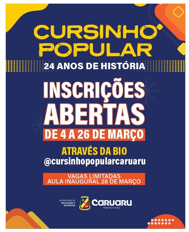 Ao total, serão disponibilizadas 600 vagas. Os interessados podem acessar diretamente a página oficial, através do @cursinhopopularcaruaru, e clicar no link da bio. As aulas têm início no dia 28 de março e acontecem todos os sábados, das 13h30 às 17h, no auditório da Secretaria de Educação e Esportes (antiga Fafica).
